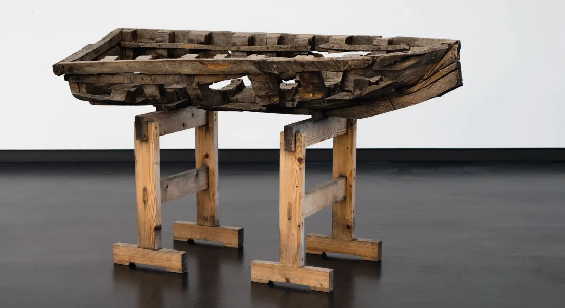 Wenige Schritte weiter findet sich ein desolates Boot, gestrandet wie ein skelettierter Wal. Als Fahrzeug ist es in diesem Zustand nicht zu verwenden, doch es ist aufgebockt – hat es vielleicht noch eine Zukunft? Der Bildhauer Hannes Goullon sägte das raue, rohe Bootsgerippe aus einem verwitterten Kastanienstamm. Die erste Annäherung an das Werk erfolgt sicher über den mythologischen Topos des Totenschiffs, doch lässt dieses Boot der Betrachter*in die Freiheit vielfältiger Assoziationen. Goullons Arbeit wurde mit dem diesjährigen Kunstpreis der Stadt Augsburg ausgezeichnet.