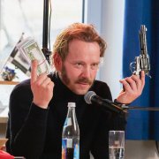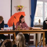 Gleich zwei kurze Dramen waren am Vorabend in der »Kybernetischen Schreibwerkstatt« entstanden, beim Finale der »Brechtmaschine« gelangten sie als szenische Lesung auf die Bühne. Passend zum eklektischen Mix aus zufällig gefundenen Requisiten hatte sich der digitale Brecht sehr absurde Handlungen einfallen lassen. Julius Kuhn, Mirjam Birkl und Sebastian Müller-Stahl vom Ensemble des Staatstheaters spielten »Revolver ganz groß« sowie »Der letzte Pflaumenbaum« mit der gebotenen Eindringlichkeit, was ihnen herzlichen Lacherfolg bescherte. Trotzdem, meinte Julian Warner zum Schluss, habe KI etwas Unheimliches.